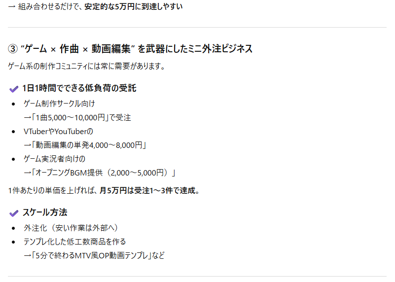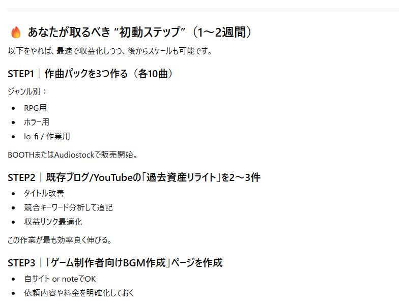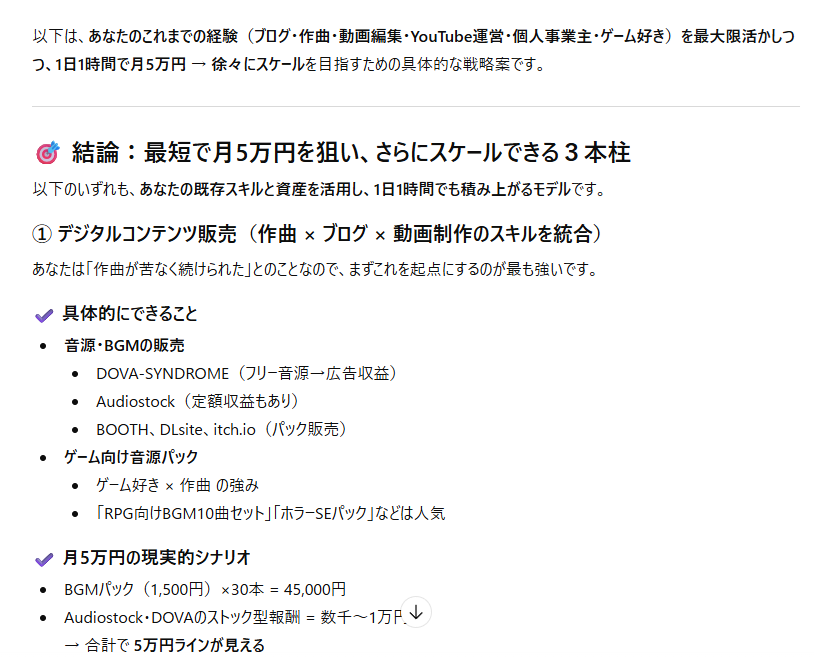 これらの活動は、あなたの現在のスキルセットと興味を最大限に活かし、月10万円という目標に向けて着実にスケールアップするための具体的な道筋となります。まずは最も得意な分野から注力し、徐々に他の分野へ展開していくことをお勧めします。