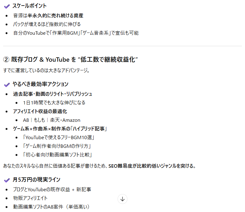 過去にブログ、作曲、動画編集、YouTubeなどで収益化の経験があるとのこと、素晴らしいスキルセットをお持ちですね。これらの経験とゲームへの情熱を活かし、月10万円の収益スケールアップを目指すための具体的な活動案をいくつかご紹介します。